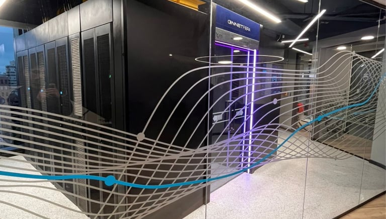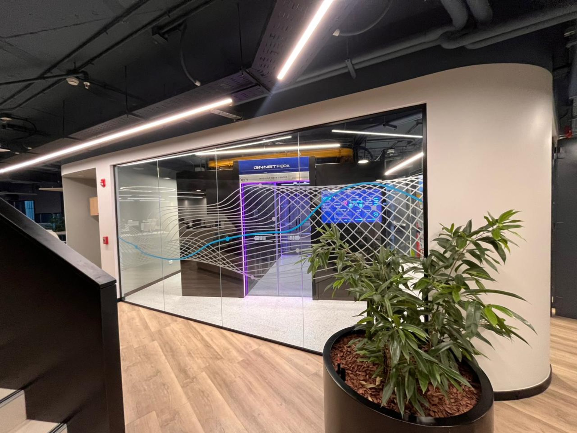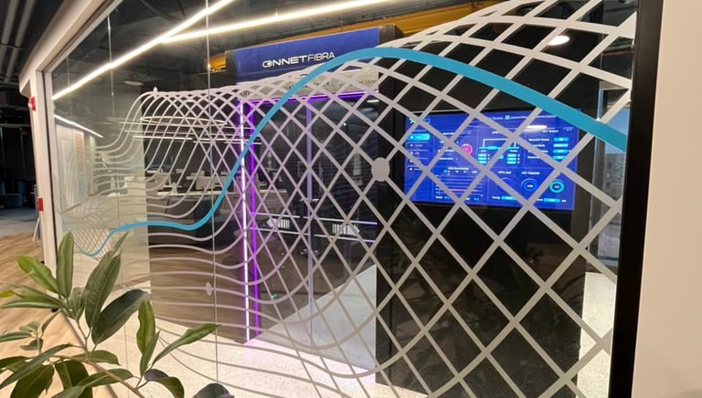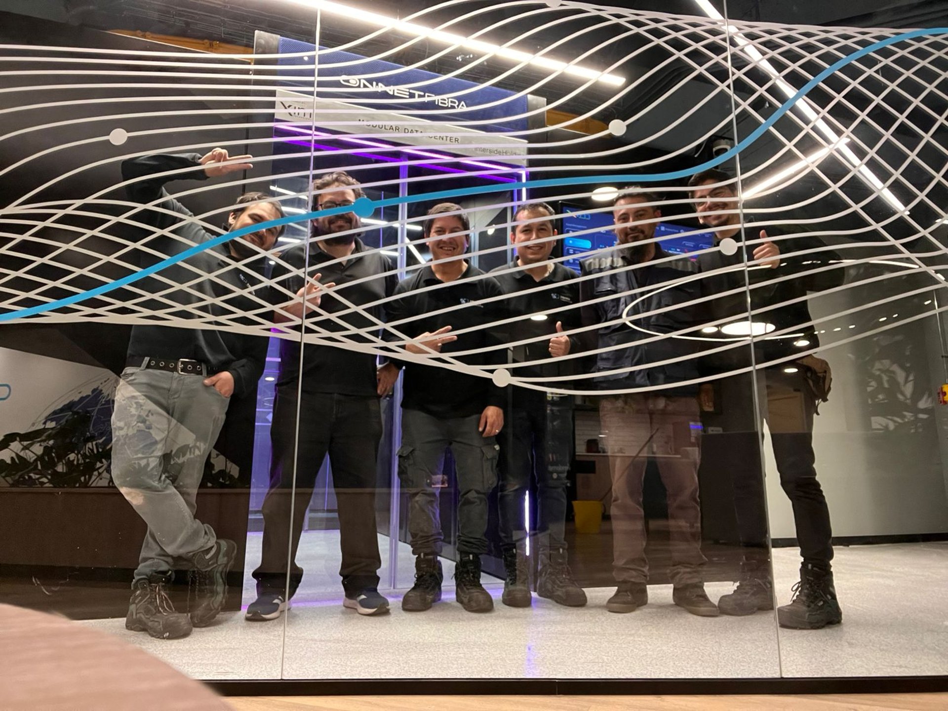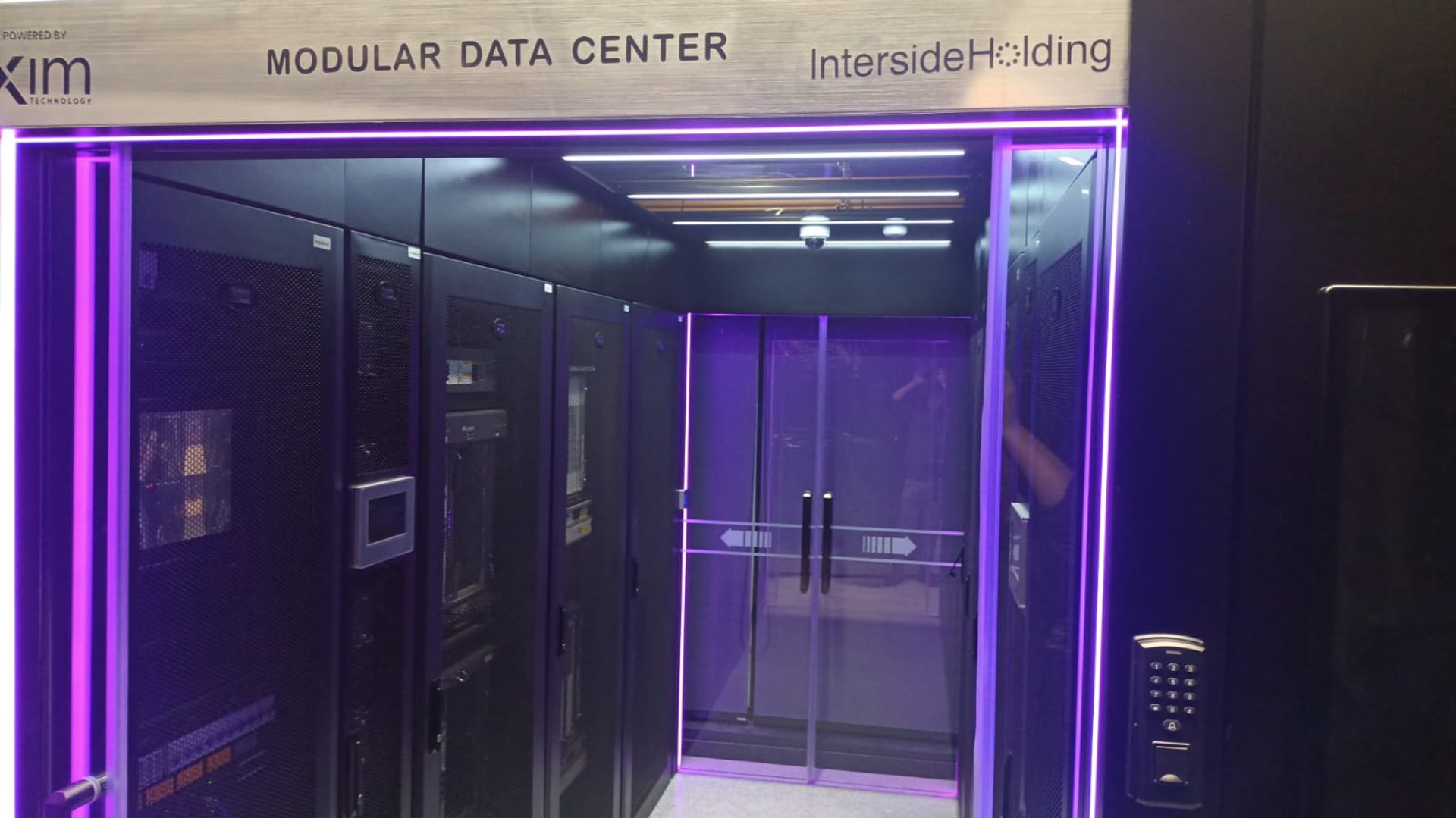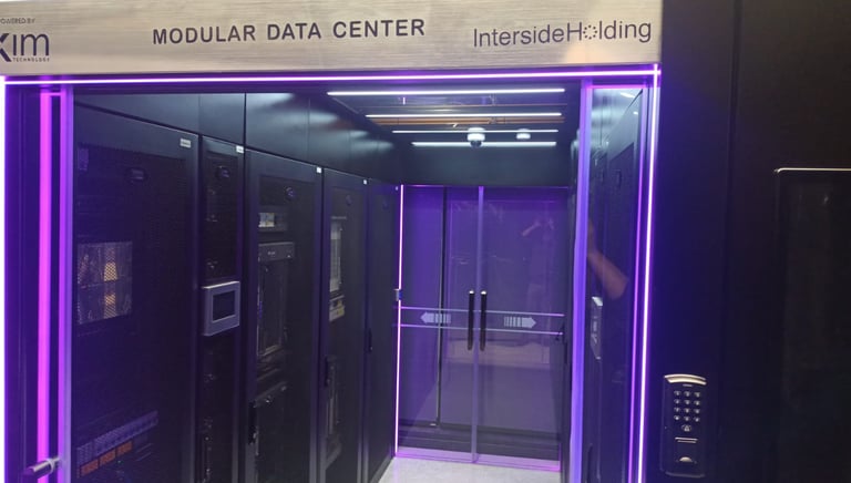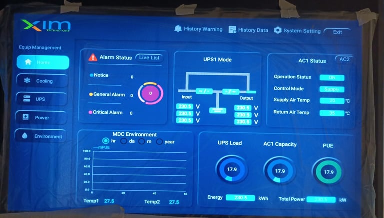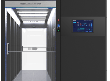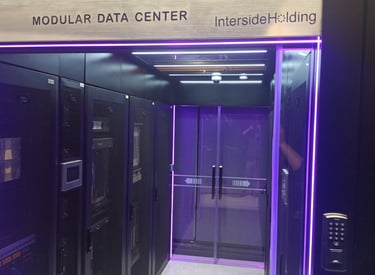 Centro de Datos modular de 8 gabinetes, con UPS y Rectificador para equipos de Telecomunicaciones, PDU inteligentes y PDU para rectificador de 48VDC, puertas automáticas con controles de acceso y monitoreo completo con pantalla de 43" Touch. Aires inrow de 17.6kW