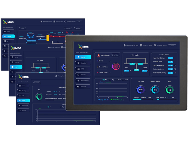 Cada uno con dos PDU inteligentes, Sensores de humedad y temperatura, apertura de puertas y derrame de liquidos conectado a un appliance y display touch que permite monitorear todas y cada uno de los elementos eléctricos y mecánicos del mini centro de datos. Por default viene un sistema de apertura automática cuando algo pueda fallar y la temperatura pueda subir.