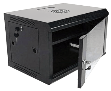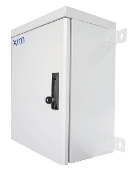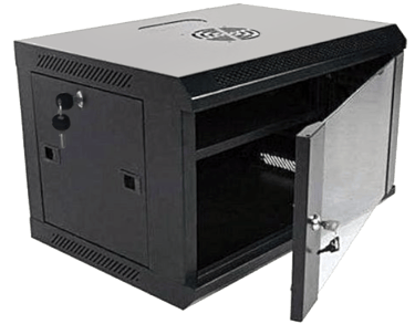 Gabinete de Exteriores de 12 unidades de rack para Telecomunicaciones para montaje en Poste elaborado en Acero Galvanizado con Grado de Protección NEMA 3R, cuenta con herraje de soporte a muro, en la puerta frontal cuenta con ventilas para el ingreso de aire protegido en su interior por filtros en malla mesh 80, ventilador en la puerta que realiza la extracción de aire caliente de la unidad.