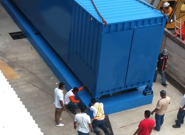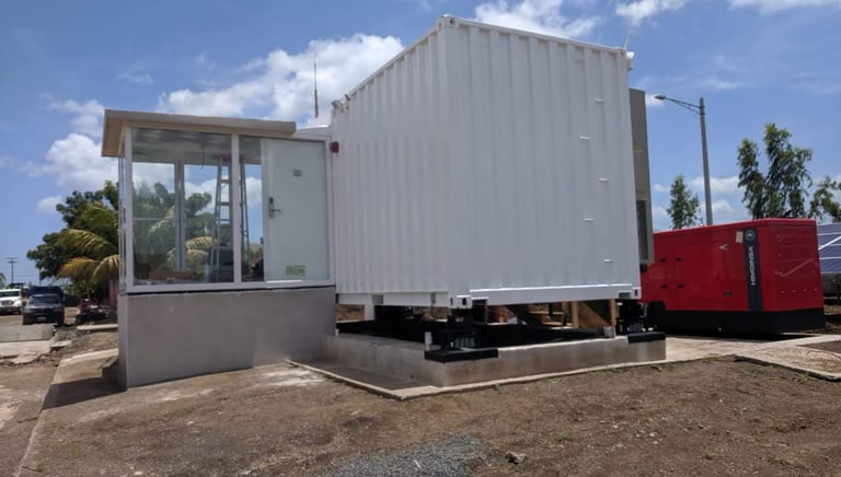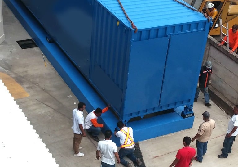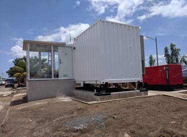 Contenedor de 40 pies, Aires Acondicionados tipo Mochila configurados en N+1, 2 UPS de 100kVA configuradas en 2N, 30 minutos de autonomía. 10 gabinetes (5 tipo colo rack), bases antisismicas.